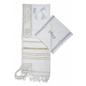 Acrylic Prayer Shawl Set with Menorah and Bible Words, White and Gold Stripes – Ateret$42.54 -